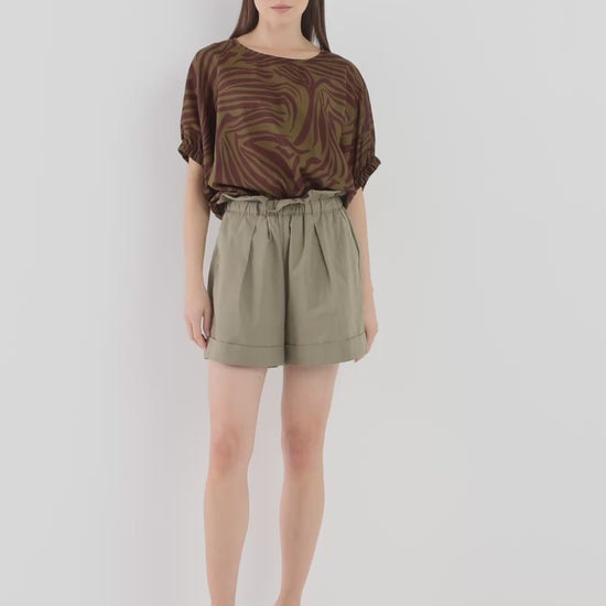 The special zebra pattern in olive-brown or light brown makes it an absolute eye-catcher – modern, sharp, yet wearable. The flowing cotton voile provides lightness, while the gathered sleeves give the look a special, relaxed coolness.
