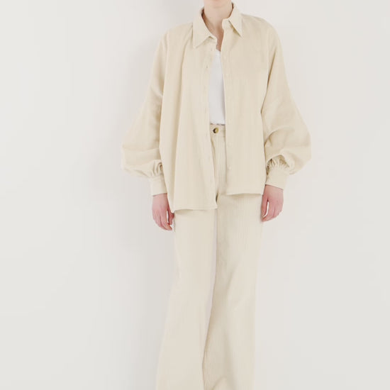 Camicia oversize in velluto a coste con maniche a palloncino – Crema