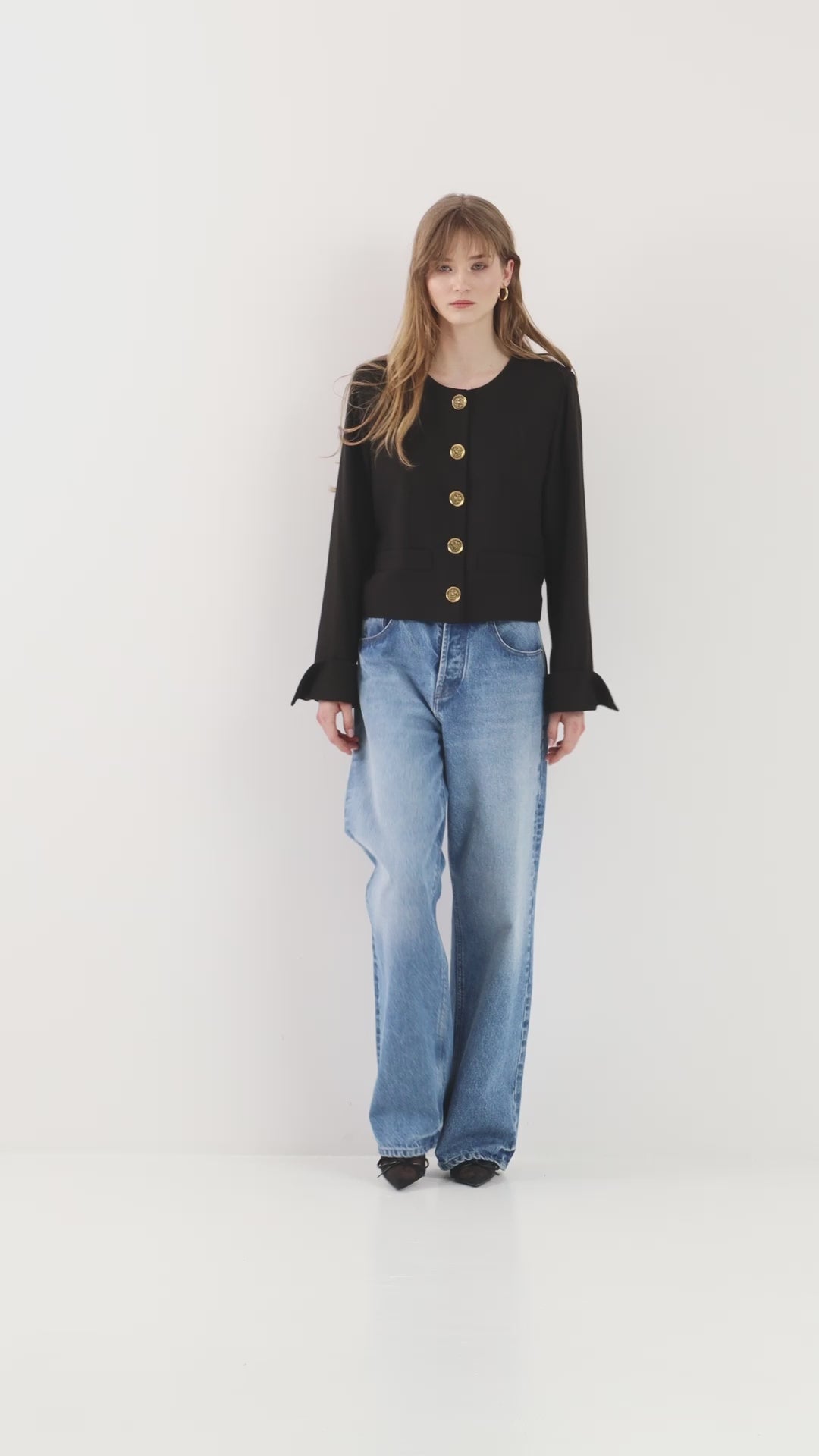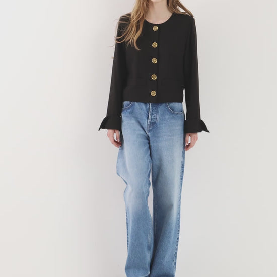 この黒のSOSUEブレザーは、スタイリッシュな登場にぴったりのステートメントピースです。襟なしのラウンドネック、ストレートなフィット、上品な金ボタンがクラシックとモダンなシックを融合。二つのフェイクフロントポケットとエレガントな袖口がルックを完成させます。