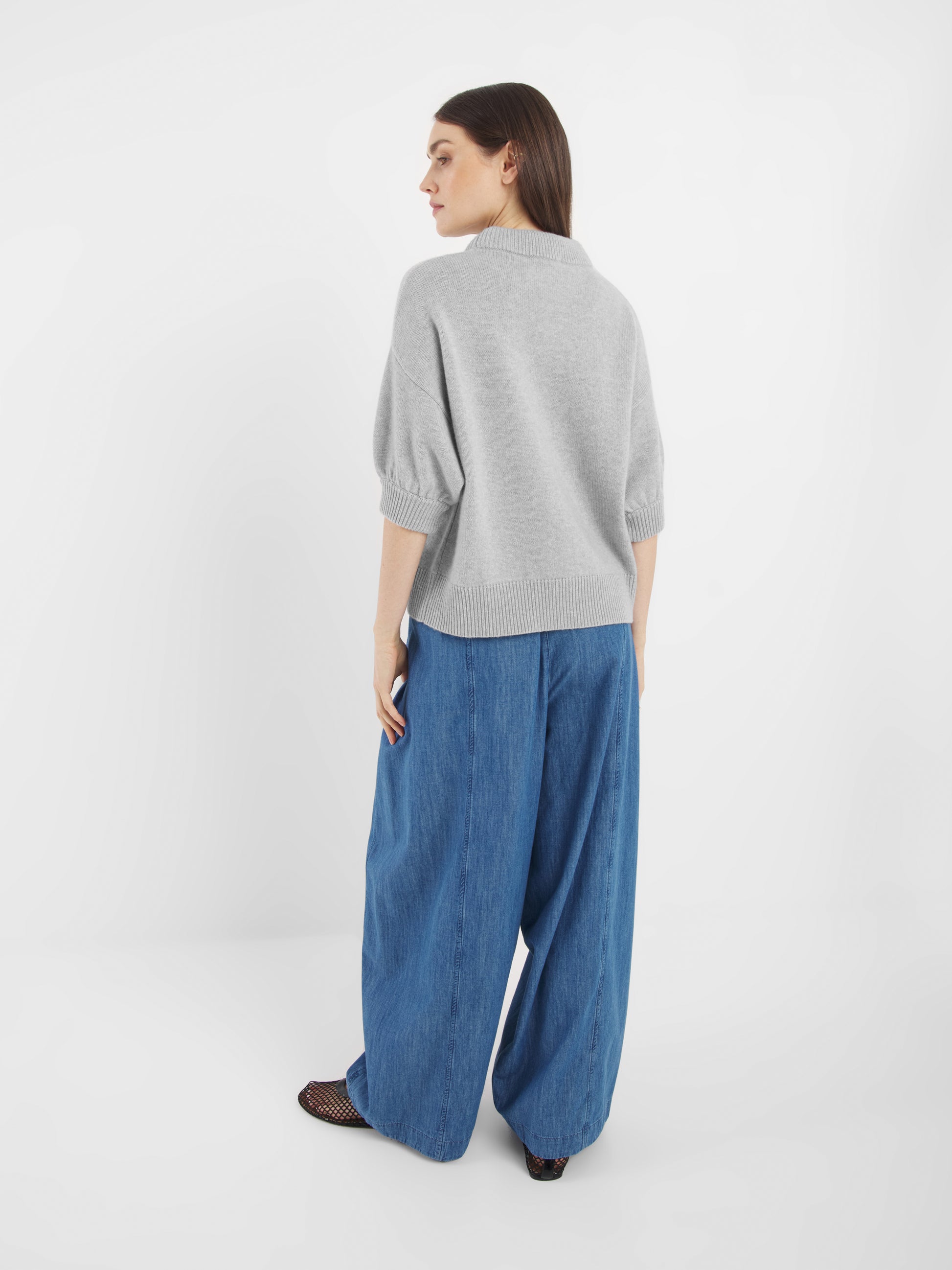 Unser hellgraue Strickpullover Josi ist ein Must-have für alle, die zeitlosen Stil und höchsten Tragekomfort lieben. Der Pullover besteht aus einem angenehm weichen Feinstrick und überzeugt mit seinem modernen, leicht kastigen Schnitt. Die verkürzten, leicht ballonförmigen Ärmel mit breiten Rippbündchen verleihen dem Design eine trendige, feminine Note.